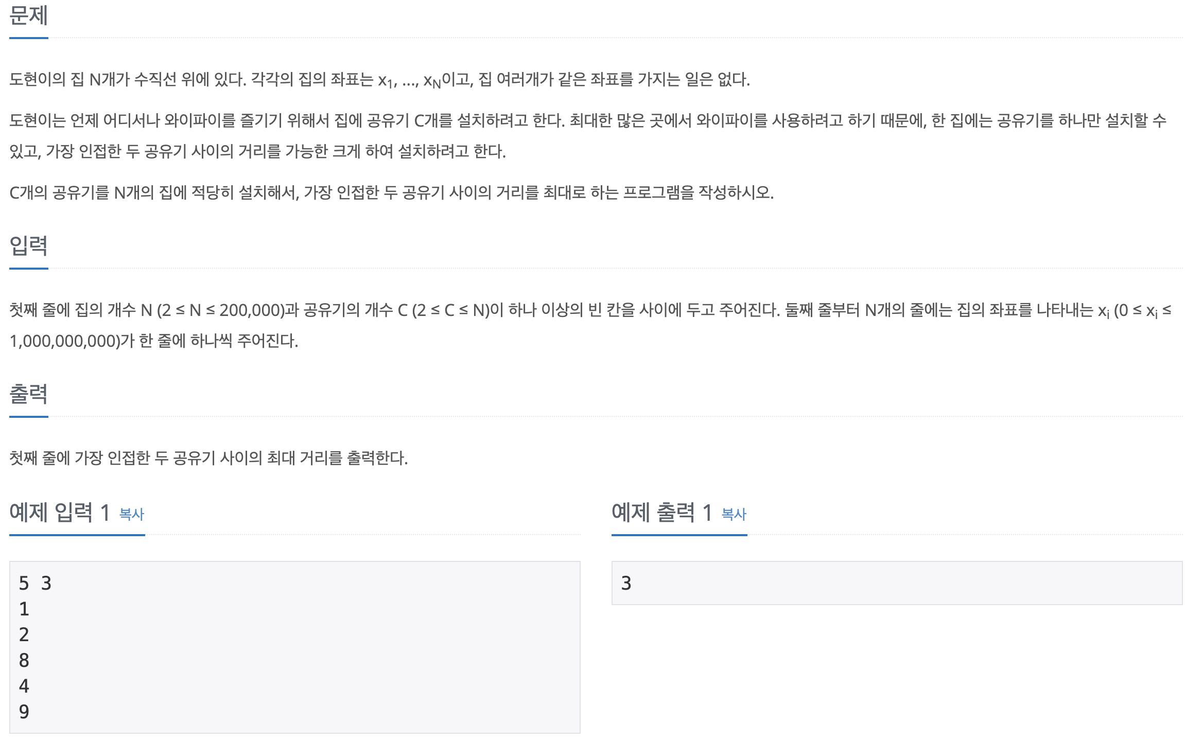 정답 코드를 작성하기 위한 핵심은 이분 탐색을 할 '주체'를 잘 선정하는 것이다. 아는 좌표적으로 이분 탐색을 진행하였는데, 문제를 풀기 위해서는 공유기기 설치 최소거리를 이분 탐색 해야한다.