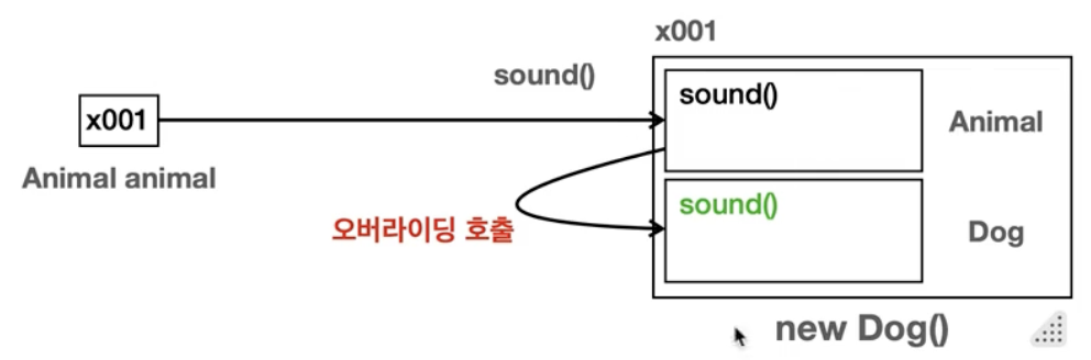 - animal 변수 타입은 Animal이므로 Dog 인스턴스에 있는 Animal 클래스 부분을 찾아서 sound() 메서드를 실행한다.