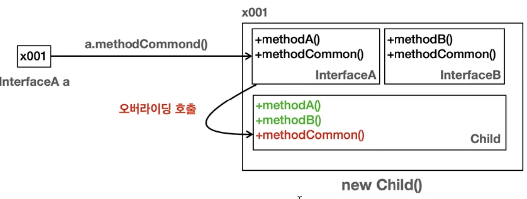 InterfaceB로 정의 된 b는 InterfaceB 인스턴스에 접근해서 자식 Child의 overriding된 메서드를 참조하는구나 !