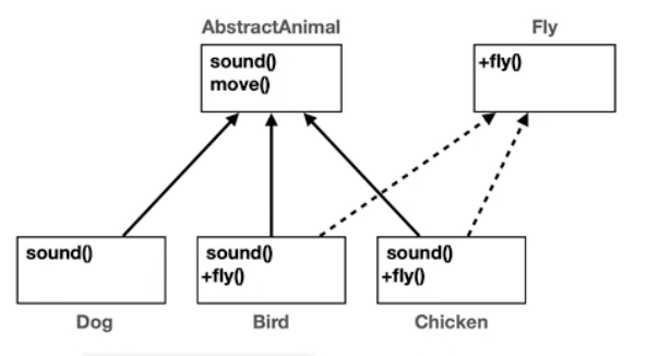 - Bird, Chicken은 날 수 있다. fly()메서드를 구현해야 함