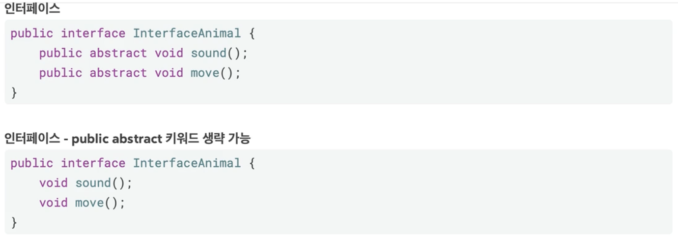 - 메서드의 public abstract를 생략할 수 있다. 참고로 생략이 권장된다.