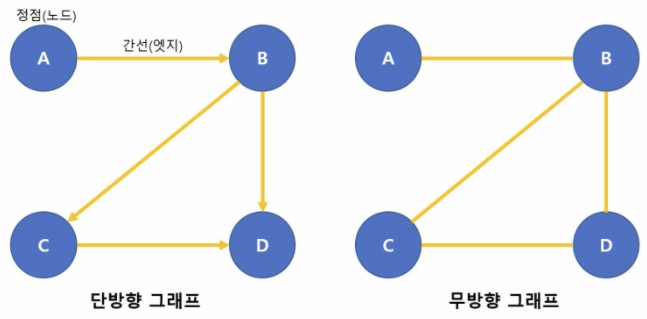 또한 간선의 방향의 유무에 따라 단방향 그래프, 무항향(양방향) 그래프로 나뉜다.