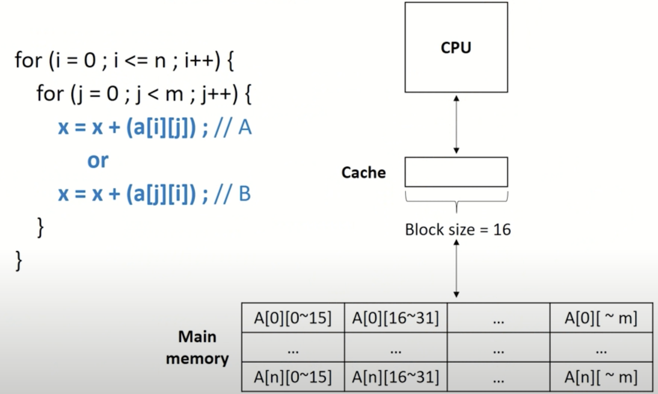 - 아래의 경우 A의 경우가 cache hit가 훨씬 많이 일어남