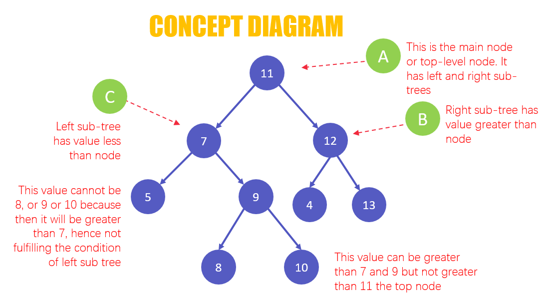 - 노드의 오른쪽 서브트리에는 그 노드의 값보다 큰 값들을 지닌 노드들로 이루어져 있다.