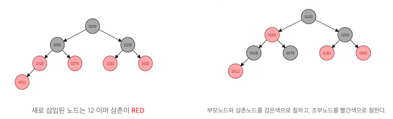- 부모의 두 자식노드가 모두 빨간 노드이면, 부모를 빨간 노드로 하고, 자식은 검정 노드로 바꿀 수 있다. (부모가 검정색 루트인 경우 예외)