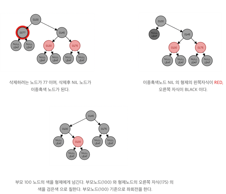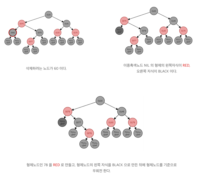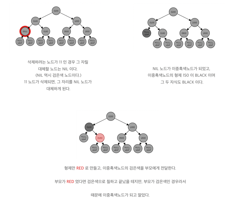 - 검정 노드는 자식이 없던가, 있다면 하나의 빨간 노드나 두개의 빨간 노드나 두개의 검정 노드를 가진다. - 하나의 검정 노드 X