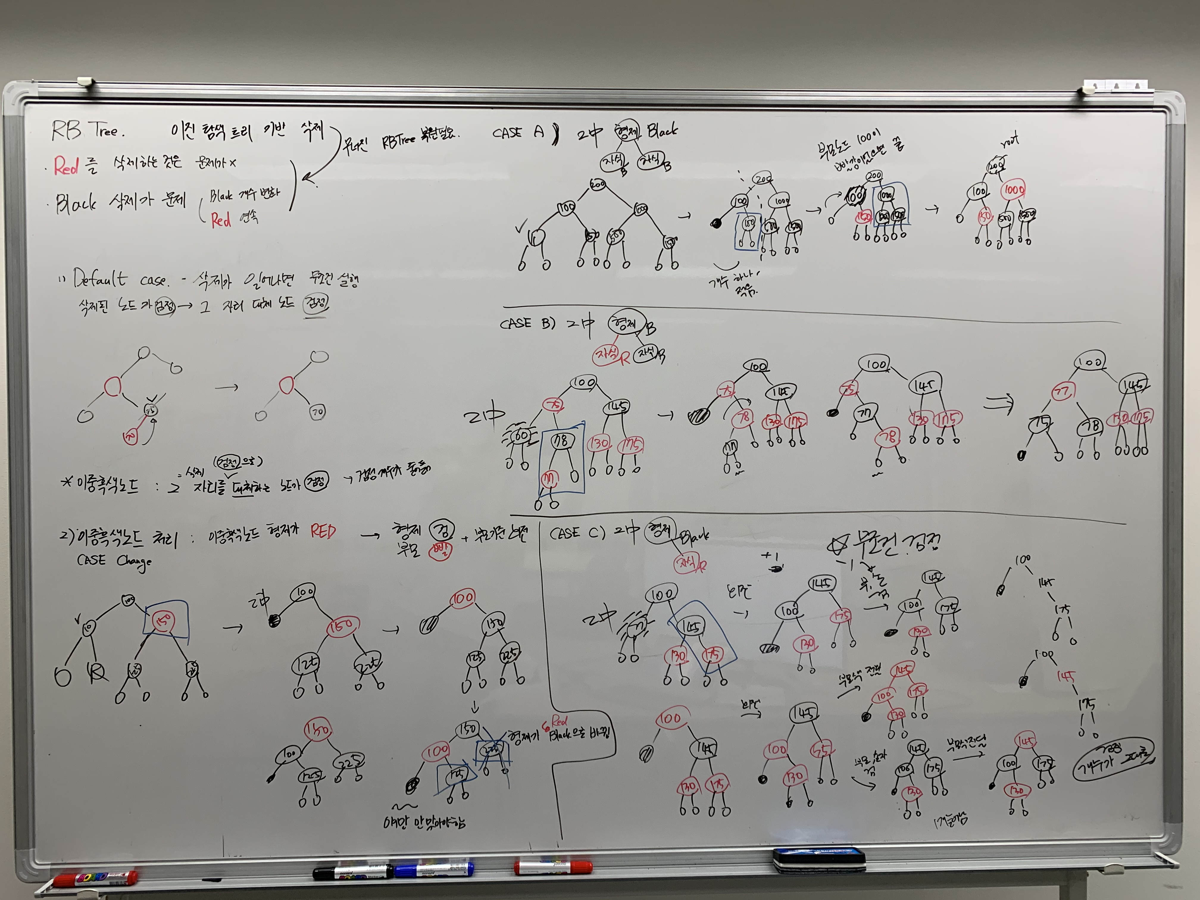 삽입되는 노드는 항상 Red인데, 부모 노드 역시 Red이면 위반이다. 이 경우 3가지 케이스가 존재한다.
