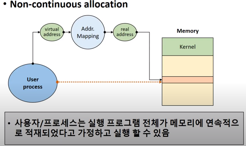 - No external fragmentation : 메모리 공간 충분한데 못 올라가는 경우 -> internal fragmentation 발생 가능(마지막에 작은 크기)