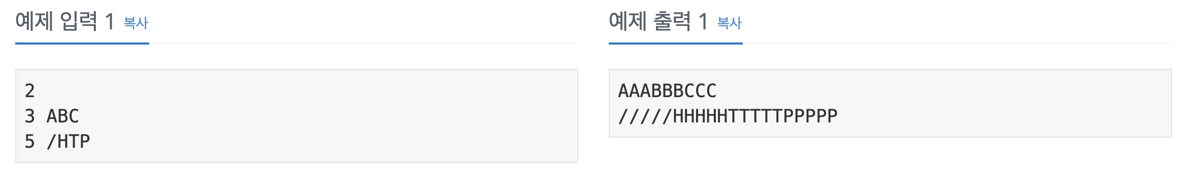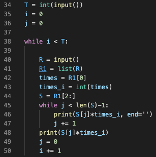 Q) 문자열 S를 입력받은 후에, 각 문자를 R번 반복해 새 문자열 P를 만든 후 출력하는 프로그램을 작성하시오. 즉, 첫 번째 문자를 R번 반복하고, 두 번째 문자를 R번 반복하는 식으로 P를 만들면 된다. S에는 QR Code "alphanumeric" 문자만 들어있다.